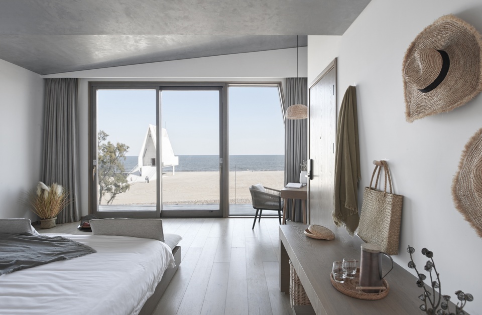 The concept of the house also makes it easy to navigate between the 2 levels. Following the stairs next to the library, one will arrive at the second floor with 4 bedrooms, each with distinguished features. Either spectacular view with the sea, or with a balcony from which you can see the sea, and also feel the breeze without the sunburn, or a frameless corner window open to the inner courtyard.