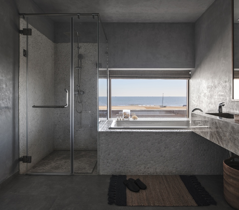 ▼住宅浴室,同样享有海景,浴缸周围使用镶嵌磨平鹅卵石