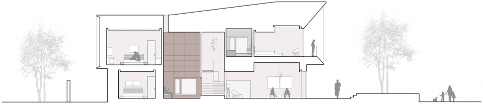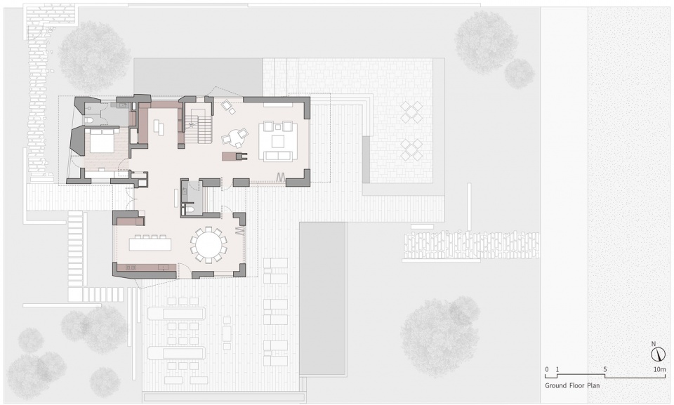 场地距离海滩仅咫尺之遥,其绝佳位置不仅可将壮丽海景尽收眼底,更因阿那亚礼堂打破海平线的尖屋顶而富有意趣。客户希望META-工作室利用场地绝佳的环境重新设计一座住宅,我们经过研究认为,原先的建筑自东向西面朝大海,又有往南延伸的部分,这一布局既能够避开夏日艳阳,还将海景最大限度地纳入眼底。于是我们在原有结构框架基础上进行了充分的利用与改造,在南侧增加稍短的侧翼以扩充开放式的生活空间。以一种可持续的方式,我们重新创造了“贯通”于建筑内的全新空间体验,使住户在住宅中穿行的同时与场地的极佳位置产生紧密联系,于偶然间邂逅其周边自然以及社群环境。
