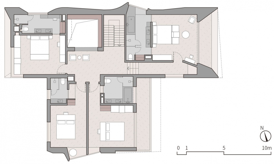 T宅的生成理念同样使住户在两层之间轻松游走。沿图书馆旁的楼梯拾级而上,便可来到二楼,这里有四间各具特色的卧室,或可一览壮丽海景,或有观海阳台令人在享受海风的同时不必受暴晒,或有面向内庭园的无框转角大窗。
