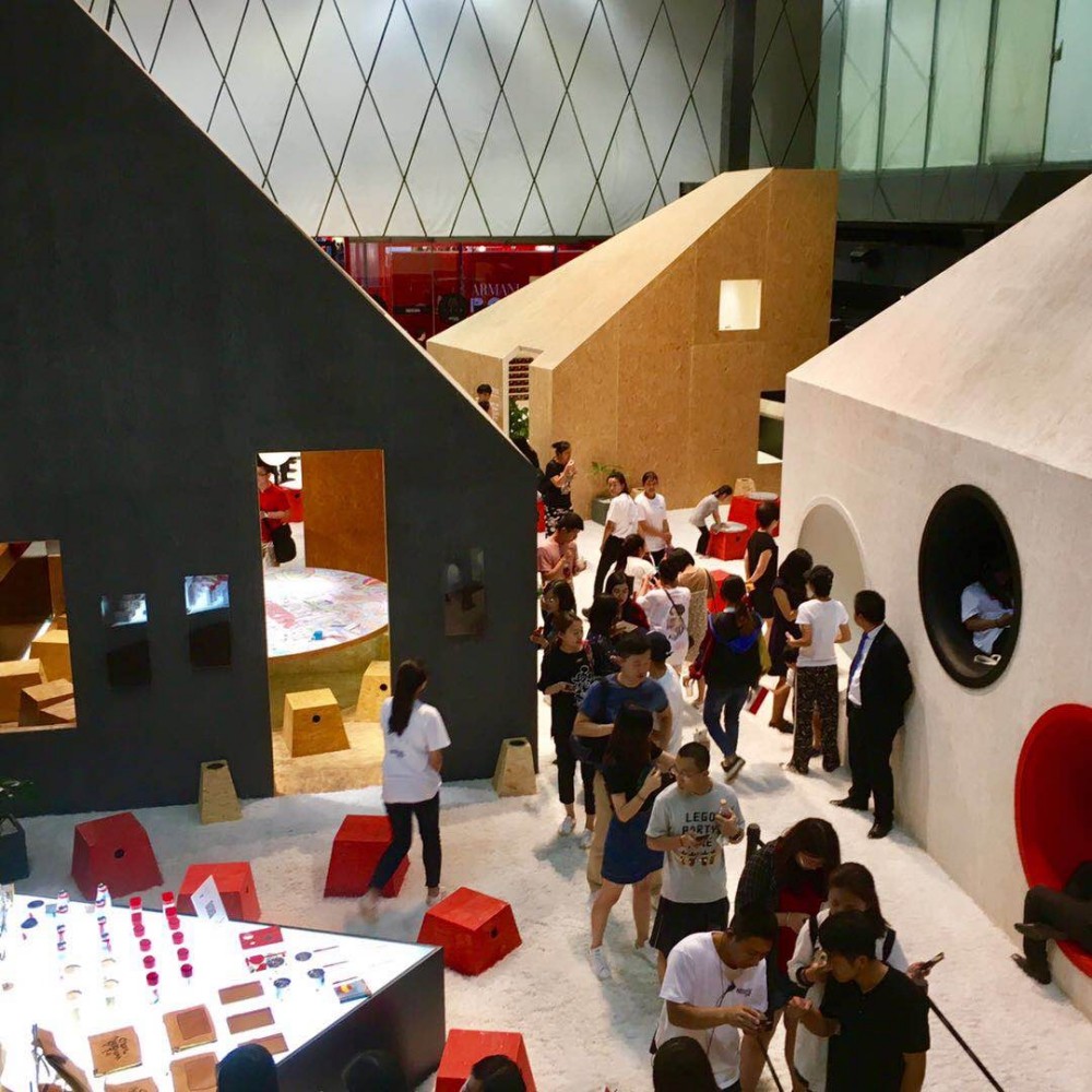 The village is full of rustic atmosphere, full of birds and flowers. It can see the stream quietly flowing and the cattle and sheep on the hillside. The exhibition,called village,brings people with the feeling of being fresh and comfortable, and is different from the metropolis. It inspires a variety of sense in diverse space.In order to create the consciousness of a small village in the city, the black bar run through five rooms of different forms and feelings.