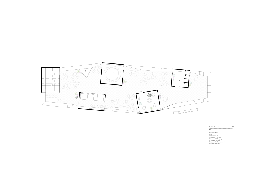 小镇,充满了乡间泥土气息,充满了鸟语花香,能看到溪水静静流淌,能看到山坡上的牛羊。小镇给予人们清新自在的感觉,与城市枯燥乏味的水泥墙截然不同,它是一个能够不断地刺激、启发和开放人们各种感觉的空间。为了营造一个城市中小镇的感觉,通过黑色吧台将五个形态各异的盒子串联起来,围合出一个充满不同感觉的“小镇”。
