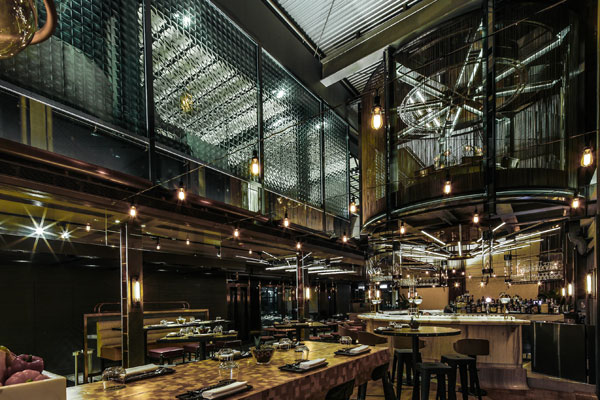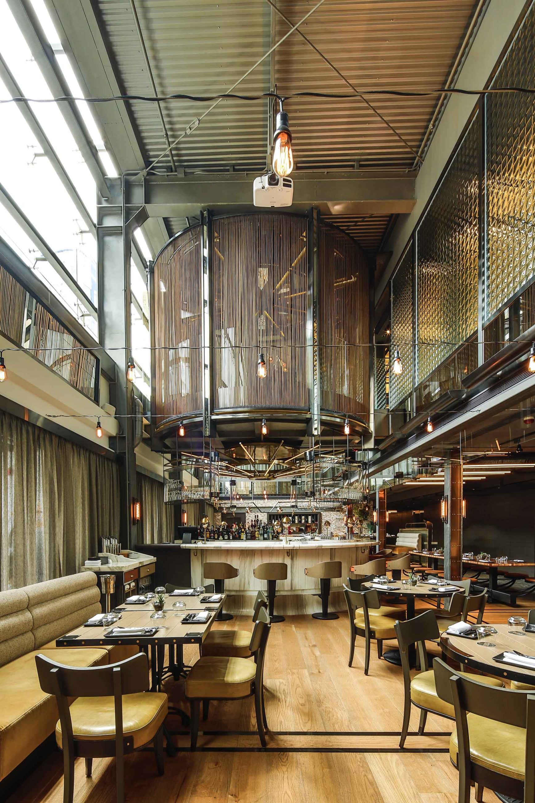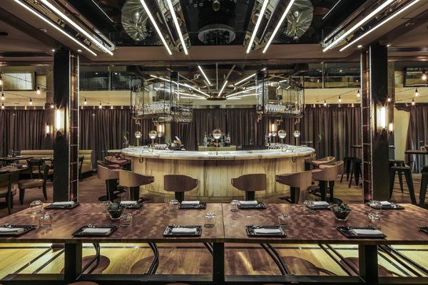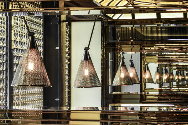 酒吧正上方悬挂着瓦斯科私密的私人餐厅休养地,由于其电枢般的轮廓和编织的铜缆,它的形式显得非常壮观和野蛮。