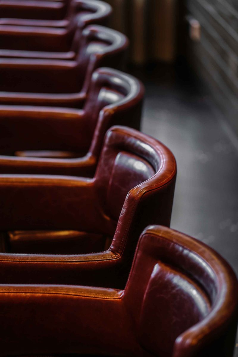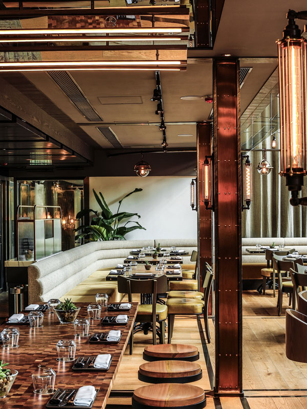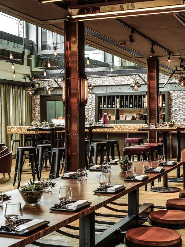 To contrast there are cool bronze and copper accents as well as raw, exposed steel structural columns, which nicely juxtapose the mix of old and new furnishings upholstered in leather or velvet to form cosy seating areas. There is also a communal table.