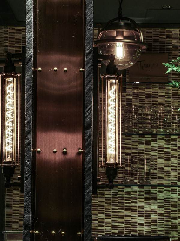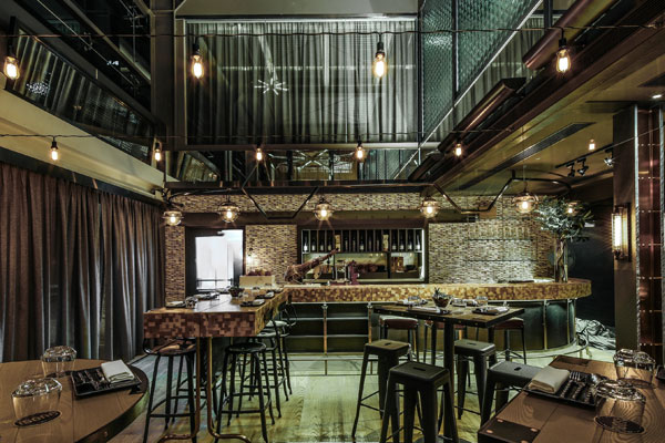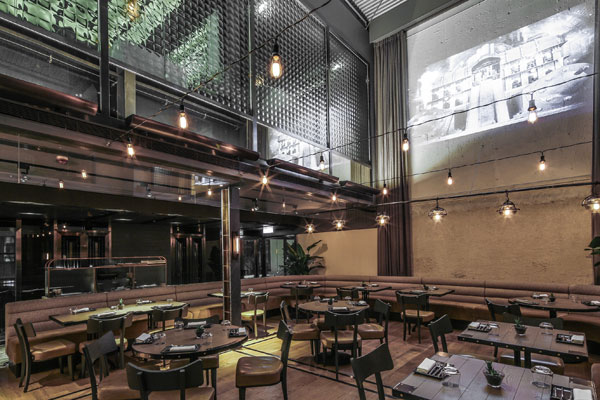 Warm, golden lighting is provided by industrial and artisanal fittings, such as exposed light bulbs and suspended glass globes. Flickers of light are also reflected from films projected onto a cement wall.