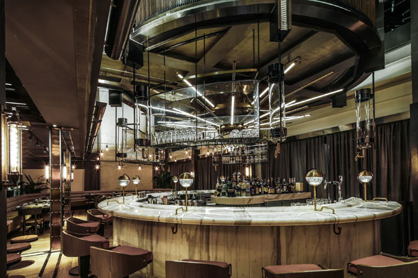 与此形成对比的是,这里有酷炫的青铜和铜色调,以及未经加工的外露钢结构立柱,它们巧妙地将皮革或天鹅绒装潢的新旧家具组合在一起,形成舒适的座椅区。还有一张公用桌。
