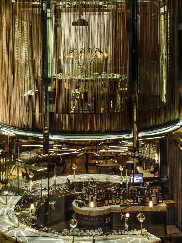 The centrepiece is the smooth marble circular bar fitted with glass and bronze globe lights at which diners can sit and marvel at the décor while enjoying tapas and vino.