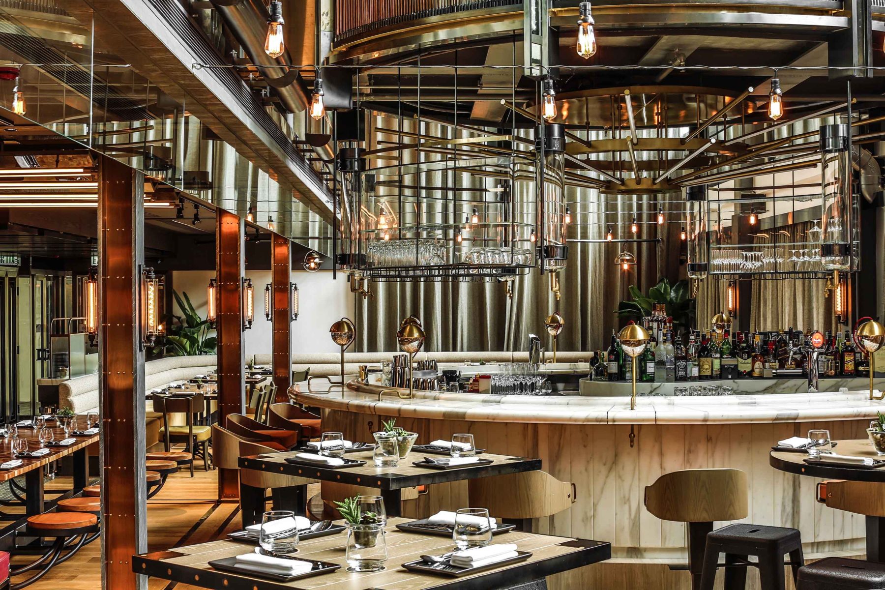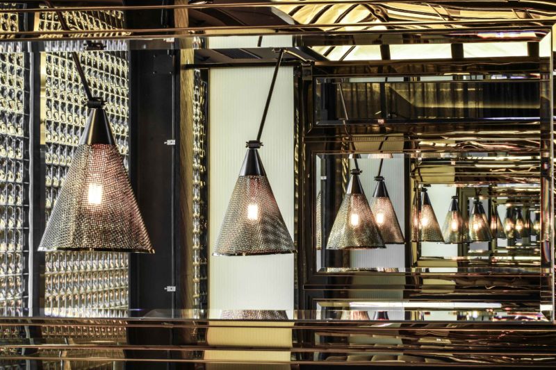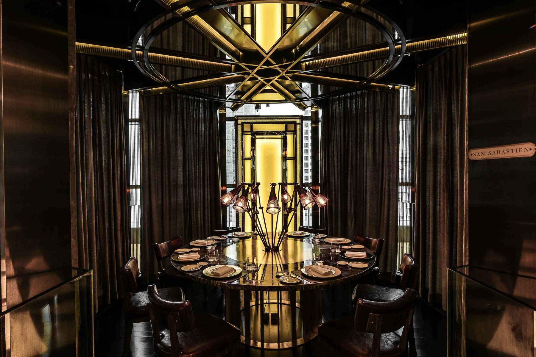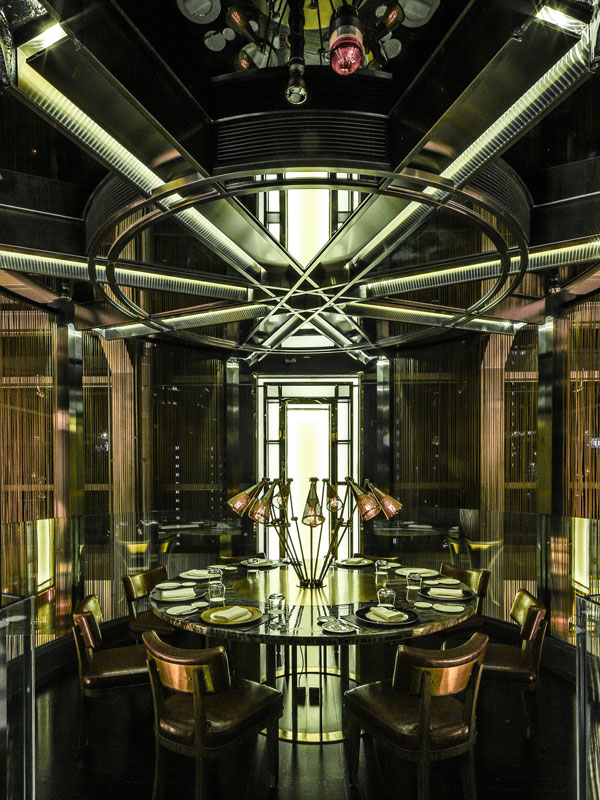 Suspended directly above the bar is Vasco’s intimate private dining retreat, which appears wonderfully monumental and Brutalist in form because of its armature-like silhouette and woven copper cabling.