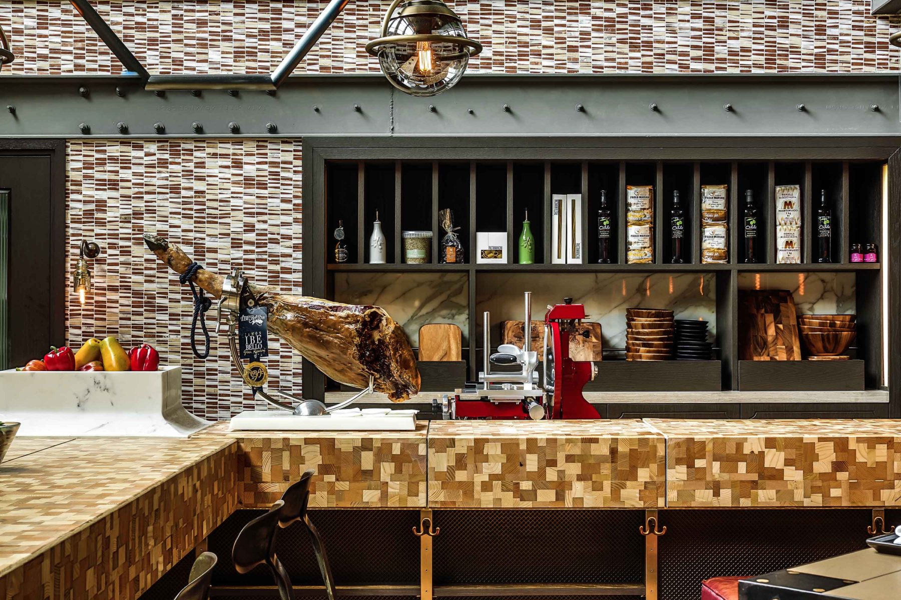 中心是光滑的大理石圆形酒吧,配有玻璃和青铜球形灯,用餐者可以坐在那里一边欣赏塔帕和葡萄酒,一边欣赏装饰。