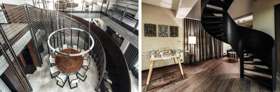 Wang created a curved staircase up to the roof of the penthouse out of bent sheet metal and lined the living room walls with thin slats of Corten steel.Metal cabling was woven between the balustrade and the baseline of the apartment's central staircase to create a screened-off dining area.“Our goal with the staircase was to create a sense of fluidity, as well as provide a private dining feel within it. It was quite a feat of engineering: we used five kilometres of cabling for the balustrades and we designed every element from scratch, including the hardware and supports.”