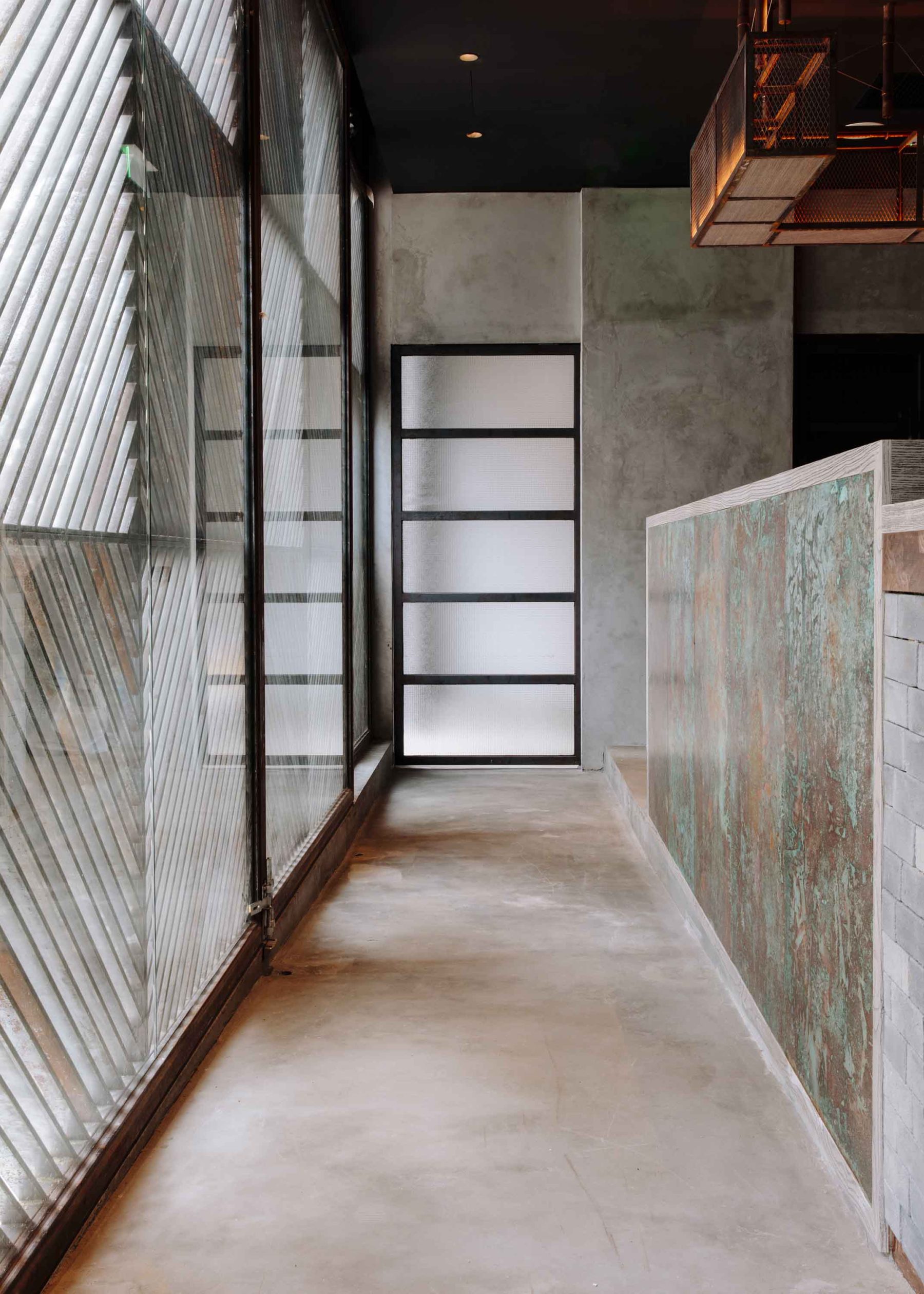 Its cedar wood was charred by a specialist in the UK after being assembled in Iceland. The maker melted copper into cracks in the wood and polished it to a smooth finish.Oversized, raw-steel garage doors at the restaurant entrance open onto the busy Hong Kong streets, which Wang believes to be the most successful design feature.
