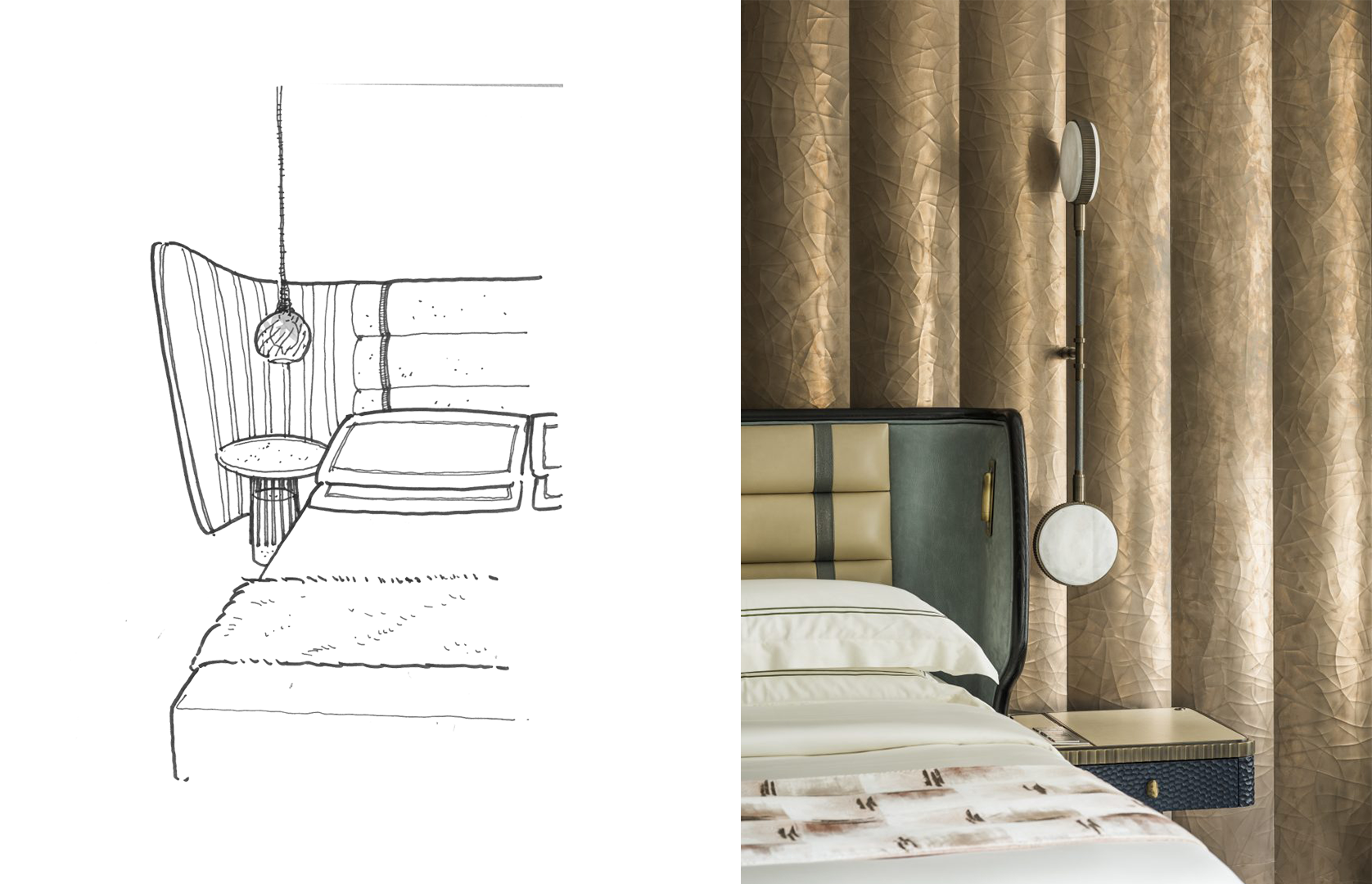 主卧有自己的休息区和独立的步入式衣柜。王的标志性风格体现在绒面革衬垫和手工簇绒丝绸地毯上,为丰富的内饰增添了质感。古老的青铜凹槽背景中的罗纹细节,与茧状床头板和床头长凳相得益彰,进一步完善了这种设计语言。