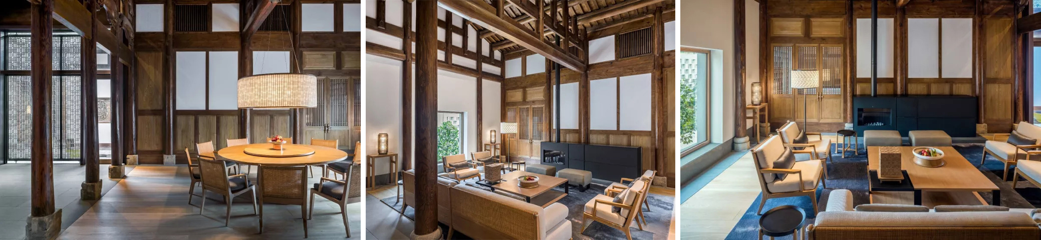 能工巧匠用50座古宅的构件重新搭建出26座古宅,这些拥有华丽雕刻的古宅述说着2000多年前的家族故事,那10000棵获救的千年古樟则或环绕四周或点缀其间,它们构成了养云安缦静谧的中心区域,是江西自然、人文、历史的生动纪念碑。