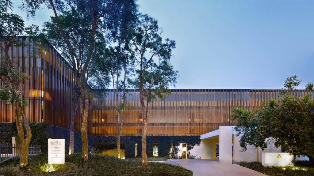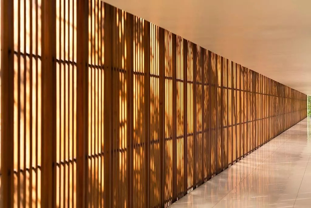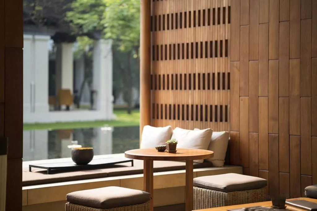 每个建筑物都在场地内形成内部庭院,且都有不同的特点。酒店建筑包括四层楼的客房,呈“L”形,围绕着一个大庭院,面向河流。面向庭院的房间外部采用柚木镶板,图案暗示了泰国传统建筑的风格。