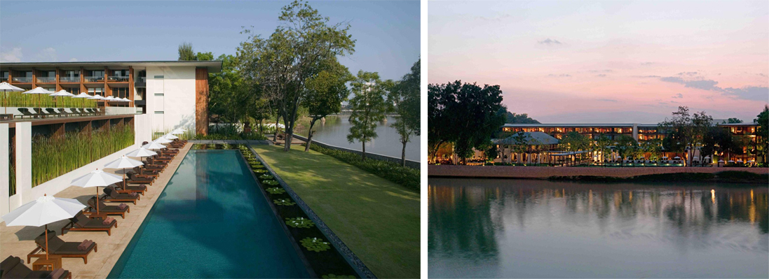 Each building forms an internal courtyard within the site and has different characteristics. The hotel building consists of four floors of guest rooms in an "L" shape, surrounding a large courtyard facing the river. The exterior of the room facing the courtyard adopts teak paneling, and the pattern implies the style of traditional Thai architecture.