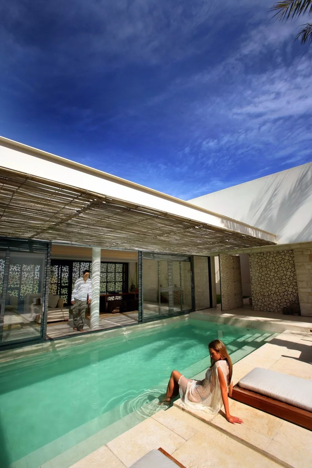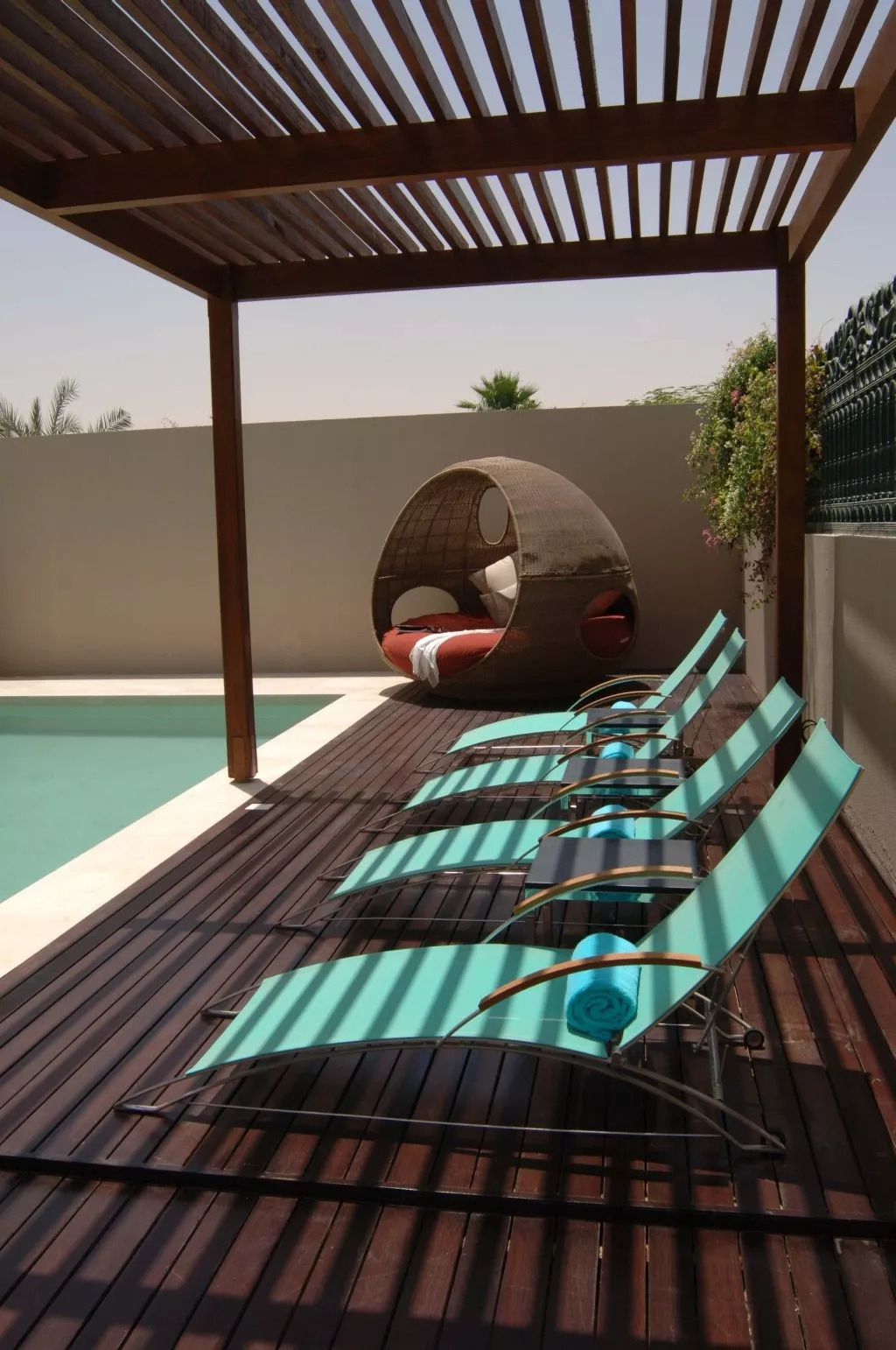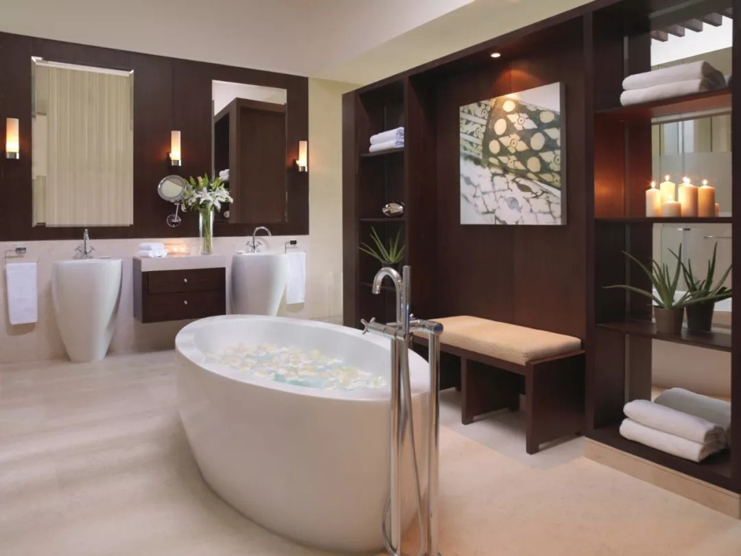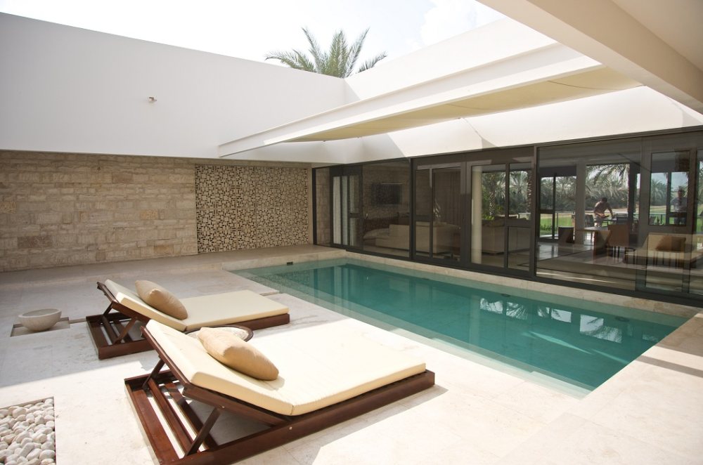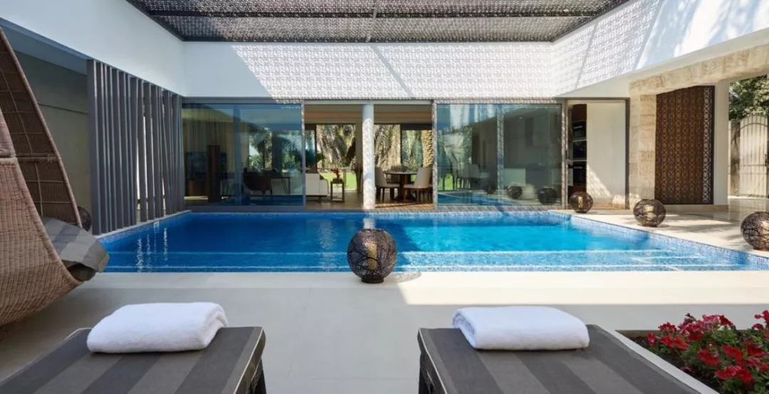 精致的花朵飘过拱门,现代空间融合了建筑与自然,棕榈树在庭院和游泳池对四周散落。健身俱乐部以郁郁葱葱的绿色马球场,棕榈树和喷泉为背景。