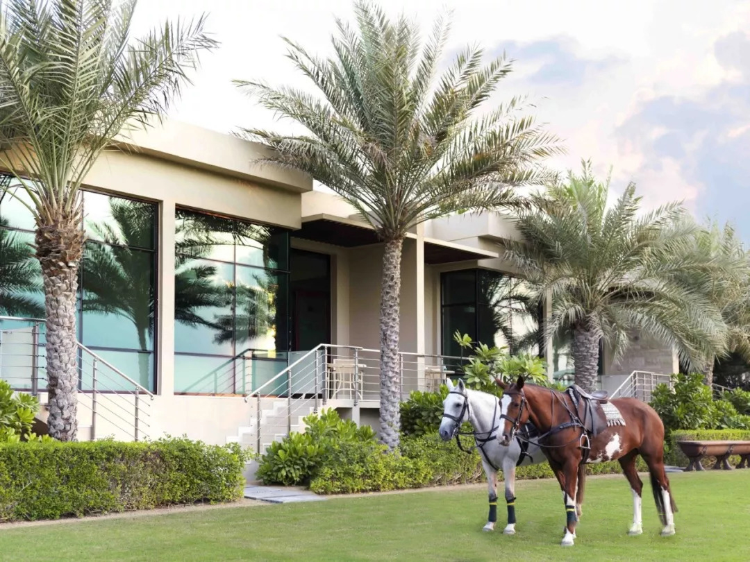 Delicate flowers float through the arch, the modern space combines architecture and nature, and palm trees are scattered around the courtyard and the swimming pool. The fitness club is set against a lush green polo field, palm trees and fountains.