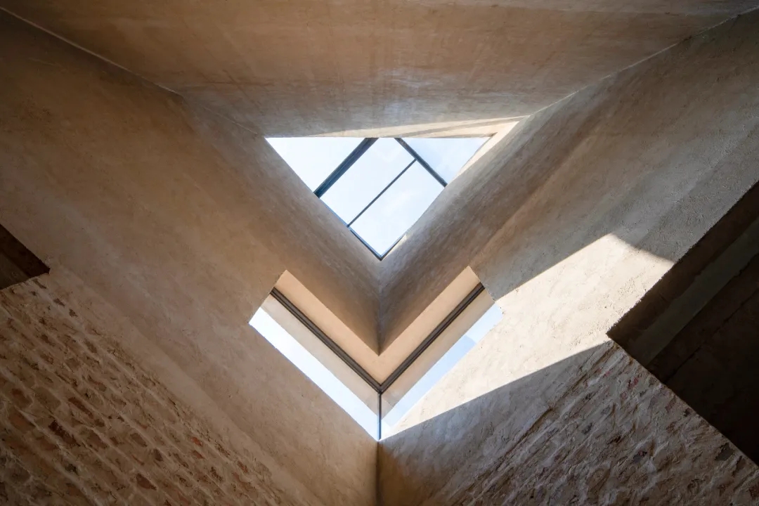 建筑一角嵌着咖啡馆和餐厅,朝小街敞开。其他房间则要通过一条细长的走廊才进得去,走廊尽头藏着一处圆院,微微偏离中心。院子中央凹陷,通过截住排水还能暂时积成浅池,成为整个空间流动的核心。来访路线虽开放连贯,却巧妙避开了村民日常聚集的角落——老人打牌搓麻将,年轻人做陶艺,都不被打扰。