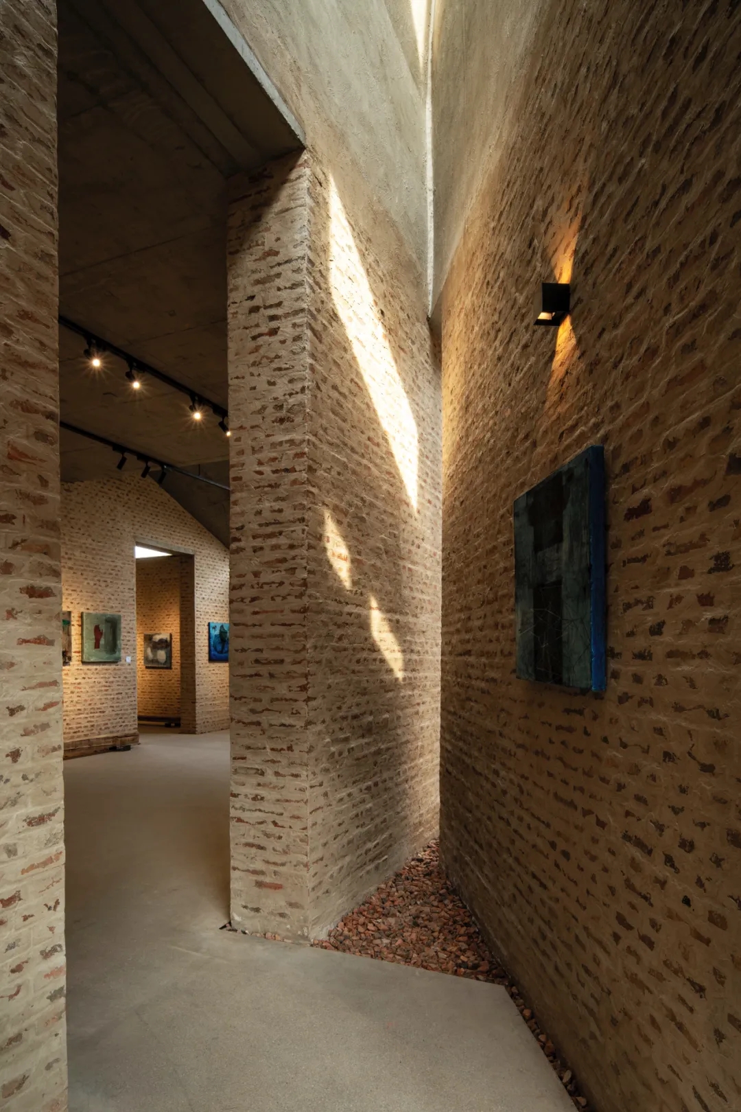 A caf é and restaurant are embedded in one corner of the building, opening onto a small street. The other rooms can only be accessed through a slender corridor, with a circular courtyard hidden at the end of the corridor, slightly off center. The central depression of the courtyard can temporarily accumulate into a shallow pool by intercepting the drainage, becoming the core of the entire space flow. Although the visiting route is open and coherent, it cleverly avoids the corners where villagers gather in their daily lives - the elderly play cards and mahjong, while the young do pottery, without being disturbed.